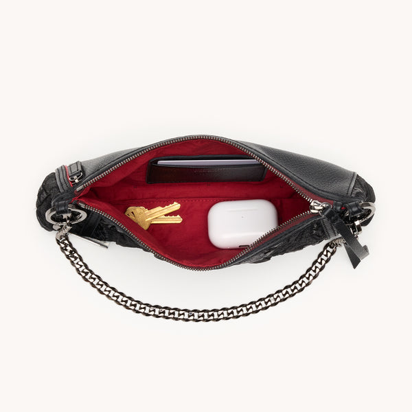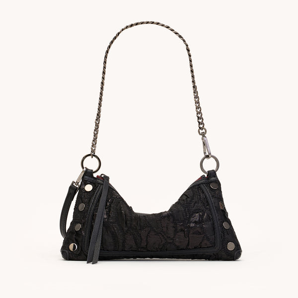 Crafted with an intricate, black Spanish Jacquard with 3D texture, a truly royal quilted tapestry with elegant peaks of silky shine, and classic, soft black pebble leather