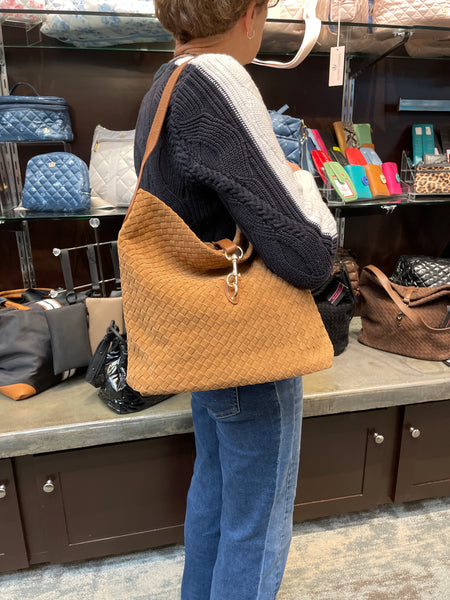 Haute Shore Sandy Hobo Handbag in Woven Saddle Faux Suede