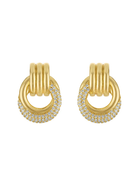 Contemporary artistry meets timeless elegance with our Gigi Knot Statement Earring. Designed with subtle luxury, these hoops align the gold tone finish with geometric brilliance. These earrings feature an intricate, intertwined structure reminiscent of a knotted motif. The top features smooth, polished gold links that cascade a CZ-encrusted circular loop.