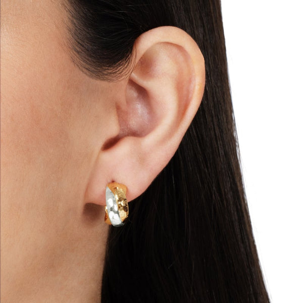 The Farrier Mixed Metal Triple Huggie Hoop Earrings is a stunning piece crafted from 18k gold plated brass and Sterling Silver plated brass, designed to embody the rugged beauty and refined elegance of traditional farriery. Each earring features a distinctive hammered texture, echoing the artisanal marks left by a blacksmith's hammer, which gives the exterior a unique, tactile surface. These small-sized huggie hoops are versatile, perfect for making a subtle statement in both everyday wear and special occasions. Secure closures ensure that these earrings are both practical and stylish, making them a beautiful blend of tradition and modernity.