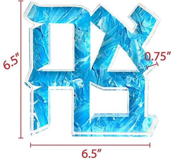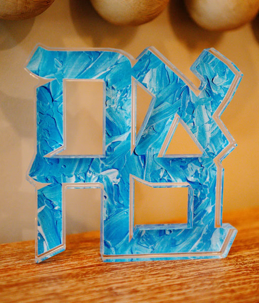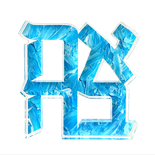 The perfect gift for family or friends! Share the LOVE with this Hebrew block. This freestanding acrylic block features an intricate Ahava cutout design revealing a hand-painted textured background. This decorative piece brings artistic depth to any bookshelf, desk, or shelf display with its rich blue texture and clean geometric form.
