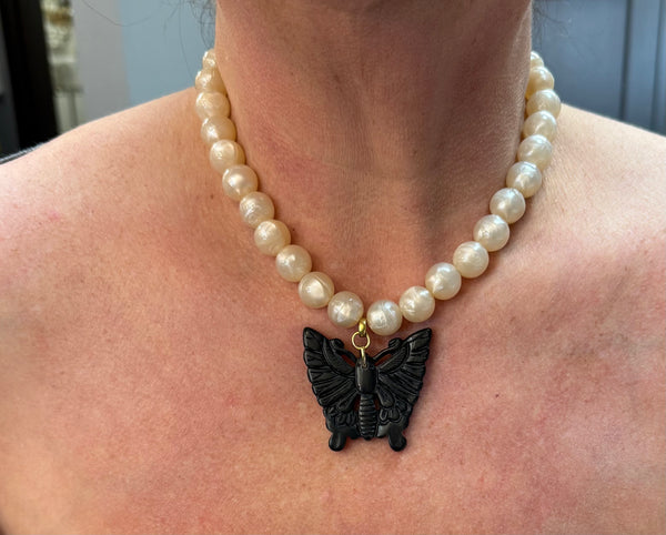 Elevate your style with the Yochi Gigi Bead and Vintage Butterfly Statement Necklace. Handcrafted in New York, this exquisite piece features 14mm beads and a striking butterfly, making it the perfect addition to any outfit.