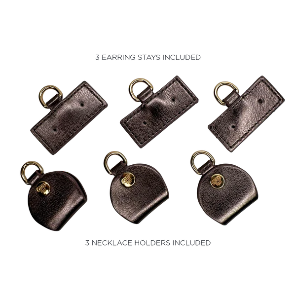 Chic, compact, and cleverly designed, the Train Jewelry Case in metallic Bronze is your go-to for maximum organization in a perfectly portable size. Ideal for small to medium jewelry pieces, it unzips to completely reveal a thoughtfully arranged interior featuring 2 elastic pockets, 3 clear front zippered compartments, and space for everything from studs to statement pieces. With 3 earring stays, 3 necklace holders, and 6 removable clear front pouches included, this soft-sided case brings effortless elegance to your travel routine - and keeps your sparkle sorted and easy to see wherever you go.