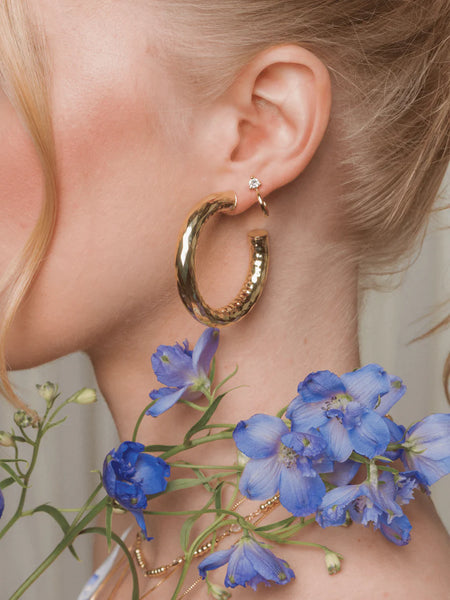 Meet our Jasmine Hoops, where elegance blends with timeless shine. These golden statement earrings are crafted perfectly to elevate your look with effortless sophistication. Bold yet exquisite, these stylish hoops boast a chunky, rounded shape and hammered texture. Available in small and large sizes, these gold earrings reflect a polished shine.